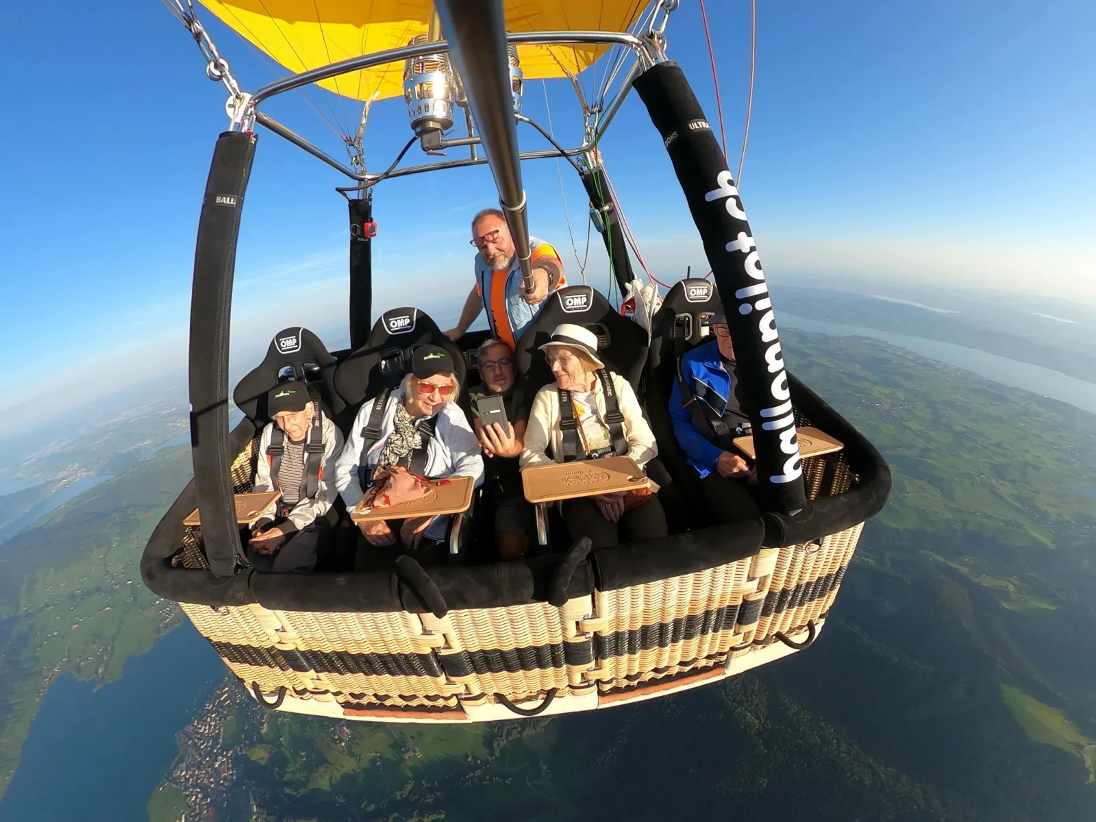 Ballonfahrt im Sitzen genießen! Mit unserem exklusiven Flying Sofa ist eine Ballonfahrt nun auch für Menschen möglich, denen dies bis heute verwehrt war. Einsteigen und Platz nehmen: Zuerst betreten Sie den Korb durch die beiden eingebauten Türen, bevor Sie in einem der 4 bequemen Schalensitze Platz nehmen dürfen. Der Pilot steht hinter Ihnen, bedient den Brenner und schon erheben Sie sich in den Himmel. Diesen exklusiven Service dürfen wir Ihnen dank der Zusammenarbeit mit dem Chlösterli in Unterägeri anbieten.